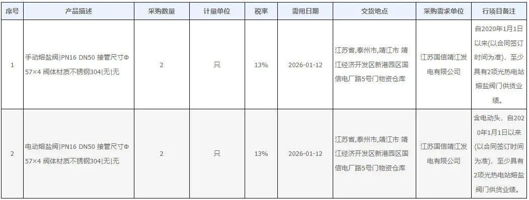 项目概况:该项目由国信靖江电厂联合西安热工研究院自主研发,为全球首个与煤电耦合的熔盐储热示范工程,包括2×660MW机组熔盐储能调峰供热项 目,设计配套储热量75MWh,于2022年12月15日成功投运。 (来源:CSPPLAZA光热发电平台) 12月29日,江苏国信靖江发电有限公司就2只手动熔盐阀与2只电动熔盐阀熔盐阀发布询价采购公告。 采购内容:2只手动熔盐阀与2只电动熔盐阀。 | 房号 | 产品描述 | 来购数量 | 计量单位 | 税率 | 霊用日期 | 交货地点 | 采购需求单位 | 行项目备注 | | --- | --- | --- | --- | --- | --- | --- | --- | --- | | 1 | 手动熔盐阀 PN16 DN50 接管尺寸Φ 57×4 阀体材质不锈钢304 无 无 | 2 | ਜ਼ | 13% | 2026-01-12 | 江苏省,泰州市,靖江市 靖 江经济开发区新港园区国 | 江苏国信靖江发 | 自2020年1月1日 以来(以合同签订 | | | | | | | | | | 时间为准),至少 | | | | | | | | 信电厂路5号门物资仓库 | 电有限公 ...