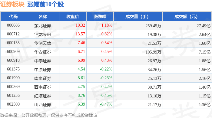证券之星消息,11月11日证券板块较上一交易日下跌1.21%,国盛证券领跌。当日上证指数报收于 4002.76,下跌0.39%。深证成指报收于13289.0,下跌1.03%。证券板块个股涨跌见下表: | 代码 | 名称 | 收盘价 | 涨跌幅 | 成交量(手) | 成交额(元) | | | --- | --- | --- | --- | --- | --- | --- | | 000686 | 东北证券 | 10.32 | 1.18% | 259.45万 | | 27.49 乙 | | 000712 | 锦龙股份 | 13.57 | 0.82% | 19.38万 | | 2.64亿 | | 600155 | 华创云信 | 7.46 | 0.54% | 21.53万 | | 1.60亿 | | 600909 | 华安证券 | 6.71 | 0.45% | 105.99万 | | 7.15亿 | | 600918 | 中泰证券 | 6.99 | 0.43% | 26.97万 | | 1.88亿 | | 601375 | 中原证券 | 4.54 | -0.22% | 34.26万 | | 1.56亿 | | 601 ...