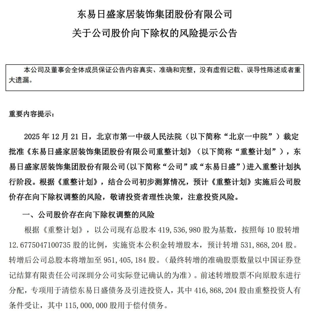 12月23日晚间,*ST东易发布关于公司股价向下除权的风险提示公告,披露本次重整中公司以资本公积金转增股本的平均价格为5.89元/股。结合股权登记 日,*ST东易的股价除权已成为必然。 随着*ST东易(SZ002713,股价10.42元,市值43.72亿元)重整计划的执行,老股东担忧的股价除权日益临近。 12月29日为股权登记日 相较于传统高送转,重整中的上市公司不会向老股东转增股票,这意味着老股东需直接承受除权导致的股价下跌。 不过,《每日经济新闻》记者(以下简称"每经记者")注意到,*ST名家、*ST宁科此前已有先例,除权后均出现了溢价的填权效应。那么,*ST东易能否 复制这一情况? 除权势在必行 此次*ST东易公布重整计划实施进度后,投资者最关心的是重整后股价将如何除权。 根据《重整计划》,以*ST东易现有总股本4.2亿股为基数,按每10股转增12.7股的比例实施资本公积金转增股本,转增后公司总股本将增至9.5亿股。前述 转增股票不向原股东分配,专项用于清偿东易日盛债务及引进投资人。 两家公司除权后均现填权行情 由于本次资本公积金转增股本是《重整计划》的重要内容,与一般情形下上市公司的资本公积金转增股本 ...