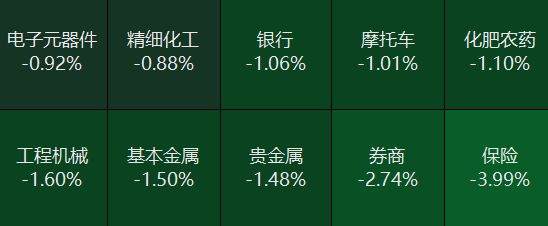 | 代码 | 名称 | 现价 | 涨跌幅 ▲ | | --- | --- | --- | --- | | 002945 | 华林证券 | 16.92 | -10.00% | | 600909 | 华安证券 | 7.11 | -5.58% | | 601688 | 华泰证券 | 23.99 | -4.88% | | 601377 | 兴业证券 | 7.27 | -4.59% | | 601318 | 中国平安 | 70.05 | -4.63% | | 000776 | 广发证券 | 22.19 | -4.19% | | 601211 | 国泰海通 | 21.27 | -4.28% | | 600030 | 中信证券 | 28.56 | -3.19% | | 600958 | 东方证券 | 10.94 | -3.10% | | 000783 | 长江证券 | 8.48 | -3.09% | | 601108 | 财通证券 | 8.70 | -3.01% | | 002736 | 国信证券 | 13.37 | -2.98% | | 002961 | 瑞达期货 | 26.25 | -2.96% | | 600053 ...