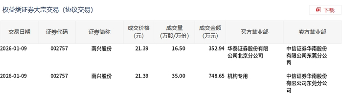 1月9日,南兴股份大宗交易成交51.5万股,成交额1101.59万元,占当日总成交额的0.37%,成交价21.39 元,较市场收盘价25元折价14.44%。 | 交易日期 | 证券代码 | 证券简称 | 成交价格 | 成交量 | 成交金额 | 买方营业部 | 卖方营业部 | | --- | --- | --- | --- | --- | --- | --- | --- | | | | | (元) | (万股/万份) | (万元) | | | | 2026-01-09 | 002757 | 更兴股份 | 21.39 | 16.50 | | 352.94 华泰证券股份有限 | 中信证券华南股份 | | | | | | | | 公司北京分公司 | 有限公司东莞分公 | | | | | | | | | 리 | | 2026-01-09 | 002757 | 南兴股份 | 21.39 | 35.00 | 748.65 机构专用 | | 中信证券华南股份 | | | | | | | | | 有限公司东莞分公 | | | | | | | | | 리 | ...