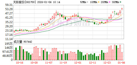两融数据显示,该股最新(1月5日)两融余额为14.65亿元,其中,融资余额为14.65亿元,近10日增加 7.18亿元,环比增长96.17%。 公司发布的三季报数据显示,前三季度公司共实现营业收入17.86亿元,同比增长23.00%,实现净利 润-1.01亿元,同比增长46.18%,基本每股收益为-0.2000元。(数据宝) (文章来源:证券时报网) 天际股份股价创出历史新高,截至9:37,该股上涨3.74%,股价报52.98元,成交量4855.58万股,成交金 额25.94亿元,换手率9.69%,该股最新A股总市值达265.63亿元,该股A股流通市值265.40亿元。 证券时报·数据宝统计显示,天际股份所属的电力设备行业,目前整体涨幅为0.81%,行业内,目前股价 上涨的有299只,涨幅居前的有高测股份、奥特维、上能电气等,涨幅分别为17.88%、13.12%、 12.18%。股价下跌的有85只,跌幅居前的有飞沃科技、红相股份、华菱线缆等,跌幅分别为9.55%、 3.78%、3.50%。 ...