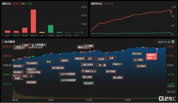 市场整体表现 - 2026年首个交易日A股市场迎来开门红,主要指数全线上涨,上证指数收报4023.42点,上涨1.38%,收复4000点关口 [1] - 深证成指收报13828.63点,上涨2.24%,创业板指收报3294.55点,上涨2.85%,科创50指数表现最强,收报1403.41点,上涨4.41% [1] - 市场交投活跃,沪深两市合计成交额达25463.13亿元,较上一交易日大幅增加5010.9亿元 [1] - 个股呈现普涨格局,沪深两市合计3959只个股上涨,1111只个股下跌,127只个股涨停,13只个股跌停 [3] 行业板块表现 - 传媒、医药生物、保险、电子、计算机、国防军工、有色金属、食品饮料、贵金属等行业涨幅靠前 [3] - 石油石化、银行、交通运输等行业跌幅居前 [3] - 涨停个股主要集中在医药生物、国防军工、机械设备、电子、建筑装饰等行业 [3] 概念板块表现 - 人脑工程、AI制药、重组蛋白、存储芯片、全息技术、医疗美容、短剧互动游戏、小红书、复合集流体等概念走势活跃 [3] - 免税、低碳冶金、海南自贸、彩票、轮毂电机等概念走势较弱 [3] 个股连板情况 - 锋龙股份录得7连板,为连续涨停板数量最多的个股 [6] - 雷科防务录得4连板 [6] - *ST东易、友邦吊顶、南兴股份均录得3连板 [6] - 另有农心科技、利欧股份、北斗星通等14只个股录得2连板 [6] 主力资金流向 - 沪深两市主力资金整体净流出62.98亿元,但创业板主力资金净流入14.97亿元,沪深300成份股主力资金净流入39.99亿元,科创板主力资金净流出42.63亿元 [7] - 31个申万一级行业中,有12个行业主力资金呈现净流入,有色金属行业净流入最多,达19.07亿元,化工、医药生物、电子行业净流入居前,分别为15.26亿元、14.52亿元、12.62亿元 [7] - 19个行业主力资金呈现净流出,汽车行业净流出最多,达31.01亿元,机械设备、通信、轻工制造等行业净流出靠前 [7] - 2321只个股获主力资金净流入,其中118股净流入超1亿元,胜宏科技净流入最多,达20.07亿元,天际股份、东方财富等净流入居前 [9][11] - 2850只个股遭主力资金净卖出,其中108股净卖出超1亿元,航天发展净流出最多,达16.49亿元,新易盛、顺灏股份等净流出居前 [13][14] 龙虎榜机构动向 - 机构席位资金合计净卖出约4.97亿元,其中净买入个股13只,净卖出个股19只 [17] - 机构净买入最多的股票是蓝色光标,净买入金额约1.86亿元,海科新源、东微半导等获机构净买入 [17] - 机构净卖出最多的股票是五洲新春,净卖出金额约2.21亿元,中超控股、盐湖股份等遭机构净卖出 [17][18]