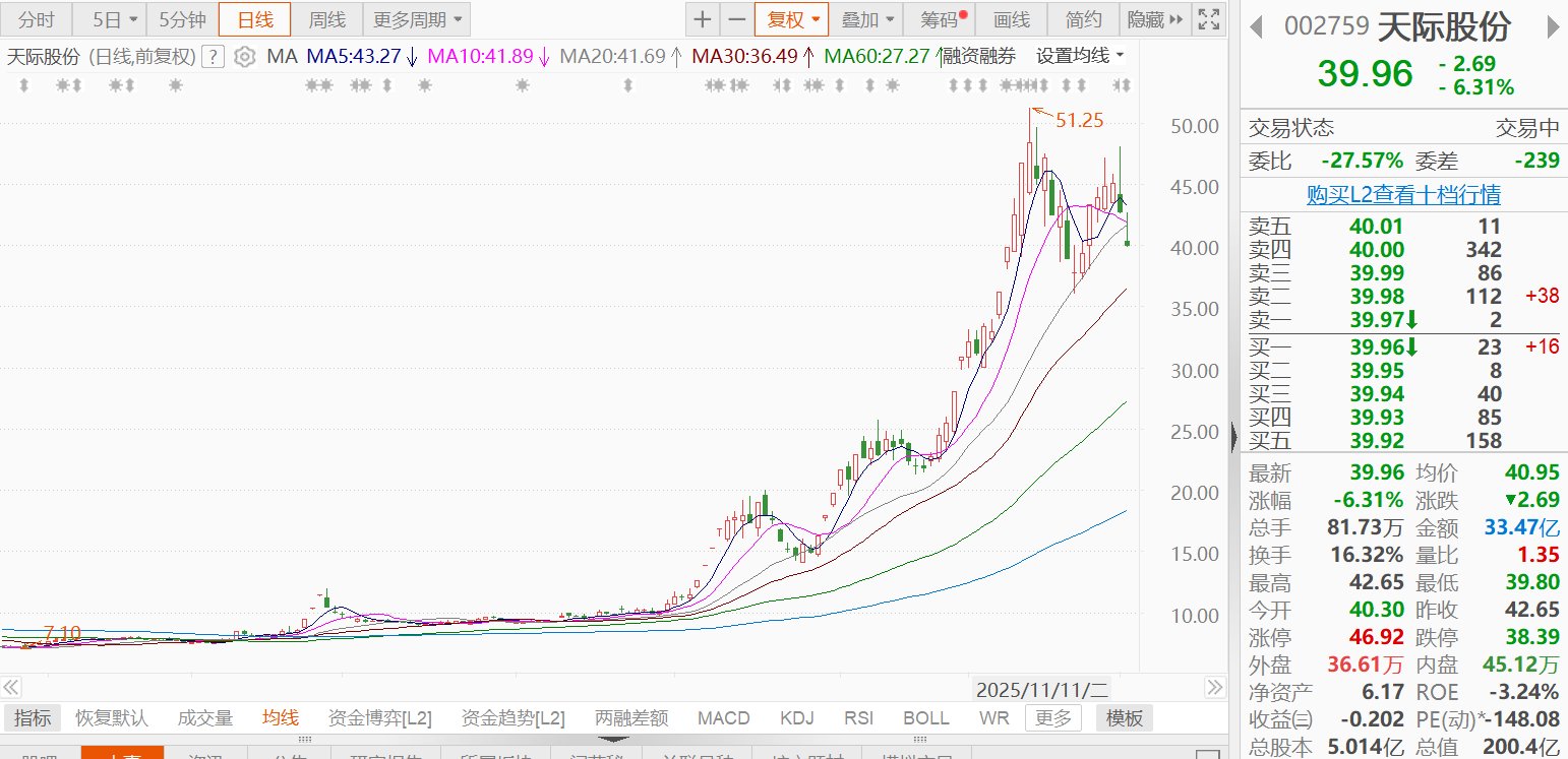公司股价与交易表现 - 天际股份股价下跌6.31%,报收于39.96元人民币 [1] - 公司总市值为200.4亿元人民币 [1] 股东权益变动 - 持股5%以上股东瑞泰新材通过集中竞价交易方式减持公司股份497万股 [1] - 本次权益变动后,瑞泰新材持有公司股份数量为2507万股 [1] - 瑞泰新材持股比例降至4.999997%,低于5% [1] - 此次减持发生于2025年12月1日 [1]