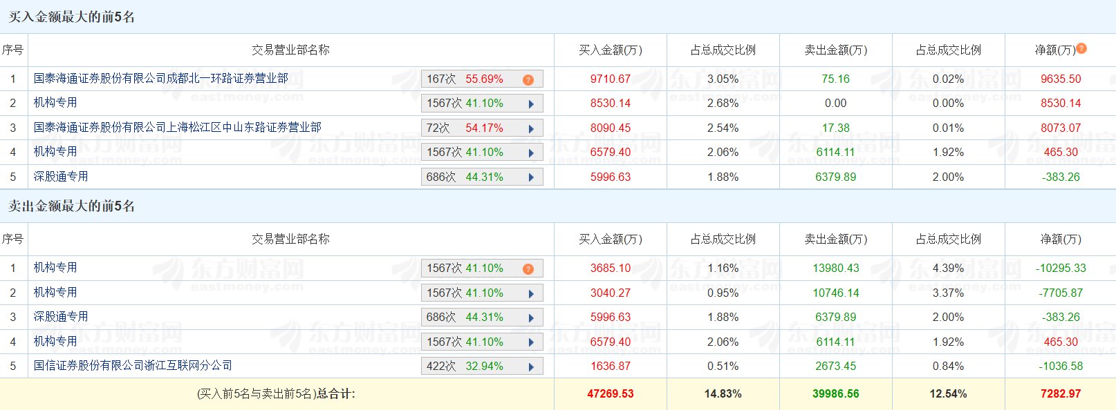 市场表现与交易数据 - 天际股份(002759.SZ)今日股价涨停,换手率达到17.41%,成交额为31.88亿元 [1] - 龙虎榜数据显示,四家机构合计买入2.18亿元,卖出3.08亿元,净卖出9006万元 [1] - 游资“成都系”位列买一席位,净买入9636万元,游资“中山东路”位列买三席位,净买入8073万元 [1] 龙虎榜买入席位分析 - 买入金额第一名为国泰海通证券股份有限公司成都北一环路证券营业部,买入9710.67万元,占总成交比例3.05% [1] - 买入金额第二名为机构专用席位,买入8530.14万元,占总成交比例2.68% [1] - 买入金额第三名为国泰海通证券股份有限公司上海松江区中山东路证券营业部,买入8090.45万元,占总成交比例2.54% [1] - 买入金额第四名为机构专用席位,买入6579.40万元,占总成交比例2.06% [1] - 买入金额第五名为深股通专用席位,买入5996.63万元,占总成交比例1.88% [1] 龙虎榜卖出席位分析 - 卖出金额第一名为机构专用席位,卖出3685.10万元,占总成交比例1.16% [2] - 卖出金额第二名为机构专用席位,卖出3040.27万元,占总成交比例0.95% [2] - 卖出金额第三名为深股通专用席位,卖出5996.63万元,占总成交比例1.88% [2] - 卖出金额第四名为机构专用席位,卖出6579.40万元,占总成交比例2.06% [2] - 卖出金额第五名为国信证券股份有限公司浙江互联网分公司,卖出1636.87万元,占总成交比例0.51% [2] - 龙虎榜买入前五名与卖出前五名总成交金额合计为47269.53万元,占总成交比例14.83% [2]