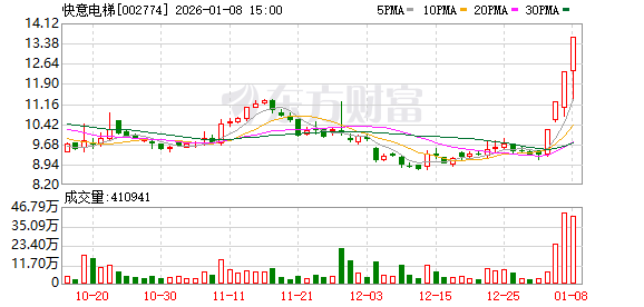 近日该股表现 | 日期 | 当日涨跌幅(%) | 换手率(%) | 主力资金净流入(万元) | | --- | --- | --- | --- | | 2026.01.07 | 9.97 | 15.42 | 7555.68 | | 2026.01.06 | 9.99 | 8.65 | 5502.82 | | 2026.01.05 | 10.02 | 2.82 | 4116.84 | | 2025.12.31 | 0.11 | 1.41 | -447.95 | | 2025.12.30 | -1.59 | 1.00 | -193.37 | | 2025.12.29 | 0.11 | 1.32 | -155.34 | | 2025.12.26 | -2.89 | 2.46 | -456.59 | | 2025.12.25 | 1.15 | 3.16 | -251.82 | | 2025.12.24 | 0.84 | 2.92 | 467.83 | | 2025.12.23 | 2.37 | 3.51 | 1167.09 | (文章来源:证券时报网) 快意电梯盘中涨停,已连收4个涨停板,截至10:21,该股报13. ...