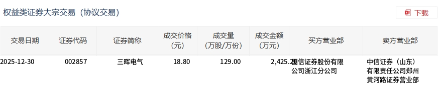 12月30日,三晖电气大宗交易成交129万股,成交额2425.2万元,占当日总成交额的38.77%,成交价18.8元,较市场收盘价 20.53元折价8.43%。 | 交易日期 | 证券代码 | 证券简称 | 成交价格 | 成交量 | 成交金额 买方营业部 (万元) | 卖方营业部 | | --- | --- | --- | --- | --- | --- | --- | | | | | (元) | (万股/万份) | | | | 2025-12-30 | 002857 | 三晖电气 | 18.80 | 129.00 | 2,425.因信证券股份有限 | 中信证券(山东) | | | | | | | 公司浙江分公司 | 有限责任公司郑州 | | | | | | | | 黄河路证券营业部 | ...