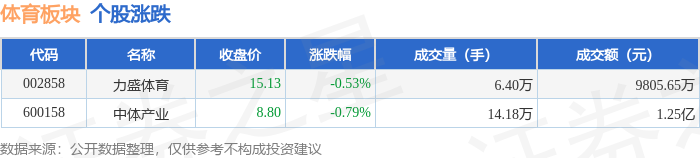 证券之星消息,12月26日体育板块较上一交易日下跌0.73%,中体产业领跌。当日上证指数报收于 3963.68,上涨0.1%。深证成指报收于13603.89,上涨0.54%。体育板块个股涨跌见下表: | 代码 | 名称 | 收盘价 | 涨跌幅 | 成交量(手) | | 成交额(元) | | | --- | --- | --- | --- | --- | --- | --- | --- | | 002858 | 力盛体育 | 15.13 | -0.53% | | 6.40万 | | 9805.65万 | | 600158 | 中体产业 | 8.80 | -0.79% | | 14.18万 | | 1.25 Z | 从资金流向上来看,当日体育板块主力资金净流出1883.64万元,游资资金净流入1047.17万元,散户资金 净流入836.47万元。体育板块个股资金流向见下表: | 代码 名称 主力净流入(元) 主力净占比 游资净流入(元) 游资净占比 散户净占比 | | | | | | --- | --- | --- | --- | --- | | 002858 力盛体育 -371.35万 -3.79% | 738 ...