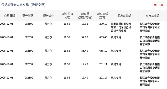 大宗交易概况 - 2025年12月1日,科力尔发生大宗交易,总成交165.31万股,总成交金额1910.97万元,占该股当日总成交额的11.22% [1] - 大宗交易成交均价为11.56元,较当日市场收盘价13.1元折价11.76% [1] 交易明细分析 - 当日共发生5笔大宗交易,成交价格均为11.56元 [2] - 第一笔成交17.31万股,金额200.10万元,买方为国泰海迪证券股份有限公司深圳登良路证券营业部,卖方为长江证券股份有限公司深圳福华路证券营业部 [2] - 第二笔成交54.80万股,金额633.49万元,买方为机构专用席位,卖方为长江证券股份有限公司深圳福华路证券营业部 [2] - 第三笔成交58.40万股,金额675.10万元,买方为机构专用席位,卖方为长江证券股份有限公司深圳福华路证券营业部 [2] - 第四笔成交17.40万股,金额201.14万元,买方为机构专用席位,卖方为长江证券股份有限公司深圳福华路证券营业部 [2] - 第五笔成交17.40万股,金额201.14万元,买方为机构专用席位,卖方为长江证券股份有限公司深圳福华路证券营业部 [2] 交易参与方特征 - 所有5笔大宗交易的卖方营业部均为长江证券股份有限公司深圳福华路证券营业部,表明股份集中来自单一卖方 [2] - 买方中,除一笔为券商营业部外,其余四笔均为机构专用席位,显示机构投资者为主要接盘方 [2]