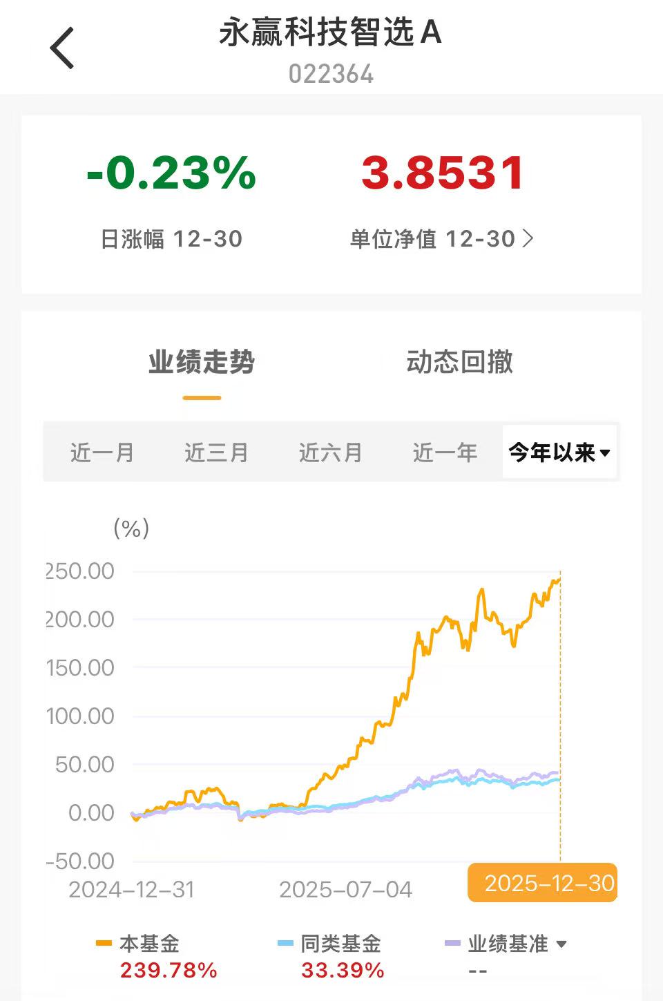 21世纪经济报道特约记者 庞华玮 2025年基金业绩角逐已无悬念。任桀管理的永赢科技智选A,以累计239.78% 的年内收益率(截至12月30日)提前锁定年度基金冠军。 这是一个现象级的年度表现,永赢科技智选不仅一骑绝尘锁定年度基金冠军,更一举超越了由传奇基金经理王亚伟保持了17年之久的年 度收益纪录(226.24%),创下了新的纪录。 在人工智能革命席卷全球的2025年,任桀——这位在2024年10月末才开始管理公募产品的"新锐",凭借对科技研究和投资,完成从研究 员到百亿基金经理的跨越,摘得行业桂冠。 极致业绩与超高波动 Wind数据显示,截至2025年12月30日,永赢科技智选A年内收益达239.78%,但其最大回撤为27.04%,年化波动率高达47.42%。 作为对比,同期偏股混合型基金的平均收益率约为33%,平均最大回撤约15%,平均年化波动率约23%。这意味着,该基金在获得遥遥领 先同类基金收益的同时,也承受了远高于同类基金的波动与回撤风险。 永赢科技智选成立于2024年10月30日,是一只发起式基金,属偏股混合型基金,成立时规模约1031.79万元。其中约98%的份额由永赢基 金及公司员工认购。 ...