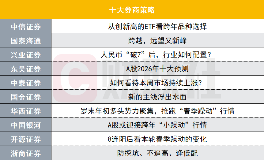 只余最后三个交易日,2025年即将落下帷幕。 本周,上证指数延续上周实现"八连涨";中国ETF总规模突破6万亿再创历史新高;离岸人民币一度"破7 "……接连不断的 利好之下,各大券商也从不同视角给出对后市的看法。 2025年的行情将如何收官?2026年又将是哪些领域独占鳌头?请看本周十大券商策略,各大券商给出的最新观点。 | | 十大券商策略 | | --- | --- | | 中信证券 | 从创新高的ETF看跨年品种选择 | | 国泰海通 | 跨越,远望又新峰 | | 兴业证券 | 人民币"破7"后,行业如何配置? | | 东吴证券 | A股2026年十大预测 | | 中泰证券 | 如何看待本周市场持续上涨? | | 国金证券 | 新的主线浮出水面 | | 华西证券 | 岁末年初多头势力聚集,抢跑"春季躁动"行情 | | 中国银河 | A股或迎接跨年"小躁动"行情 | | 开源证券 | 8连阳后看本轮春季躁动的变化 | | 浙商证券 | 防挖坑、不追高、逢低配 | 中信证券:从创新高的ETF看跨年品种选择 360个行业/主题ETF当中,39个在12月创了新高。在有共识度的品种当中,老品种是通信和有色相关ET ...