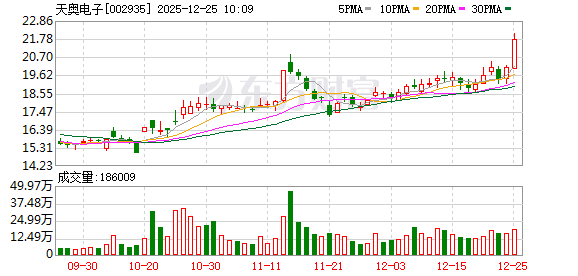 天奥电子股价创出历史新高,截至9:37,该股上涨10.01%,股价报22.09元,成交量632.07万股,成交金 额1.37亿元,换手率1.52%,该股最新A股总市值达93.68亿元,该股A股流通市值91.69亿元。 证券时报·数据宝统计显示,天奥电子所属的国防军工行业,目前整体涨幅为1.07%,行业内,目前股价 上涨的有114只,涨停的有广联航空、博云新材等4只。股价下跌的有25只,跌幅居前的有新劲刚、*ST 奥维、高德红外等,跌幅分别为2.91%、2.42%、2.00%。 两融数据显示,该股最新(12月24日)两融余额为3.25亿元,其中,融资余额为3.25亿元,近10日增加 3076.83万元,环比增长10.45%。 公司发布的三季报数据显示,前三季度公司共实现营业收入5.36亿元,同比下降7.12%,实现净利润 1522.32万元,同比下降4.51%,基本每股收益为0.0355元,加权平均净资产收益率0.96%。(数据宝) (文章来源:证券时报网) ...