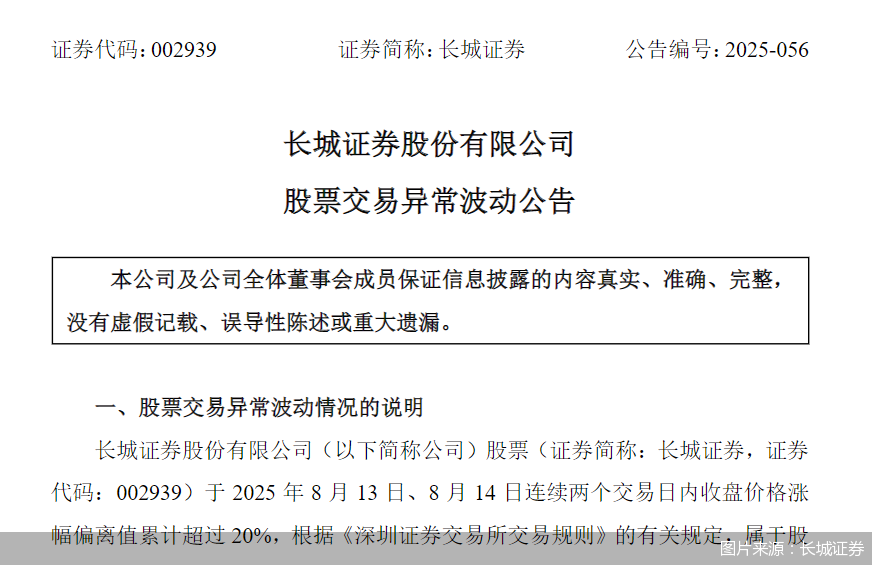 股票交易异常波动 - 长城证券连续两个交易日(2025年8月13日至14日)收盘价格涨幅偏离值累计超过20% [1] - 公司声明不存在应披露而未披露的重大信息 [1] - 公司提醒投资者注意投资风险并保持理性投资态度 [1]