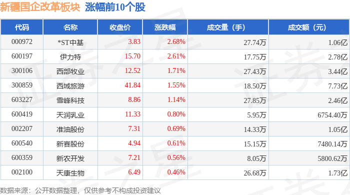 市场表现 - 新疆国企改革板块整体下跌0.1%,新疆交建以2.82%跌幅领跌 [1] - 上证指数报3727.29点(跌0.02%),深证成指报11821.63点(跌0.12%) [1] - 板块内涨幅前三个股:*ST中基(+2.68%)、伊力特(+2.61%)、西部牧业(+1.71%) [1] 个股交易数据 - 西域旅游成交额达7.73亿元居首,新疆交建成交额10.86亿元位列板块第一 [1][2] - 雪峰科技成交量27.85万手为当日最高,北新路桥成交量93.43万手居次 [1][2] - 主力资金净流入前三:伊力特(3336万元)、中泰化学(1224万元)、天富能源(1091万元) [3] 资金流向 - 板块主力资金净流出2.54亿元,散户资金净流入2.76亿元 [2] - 西域旅游主力净流出3489万元(占比4.51%),游资净流出1012万元 [3] - 青松建化散户净流入1034万元(占比4.14%),天润乳业散户净流入880万元(占比13.03%) [3]