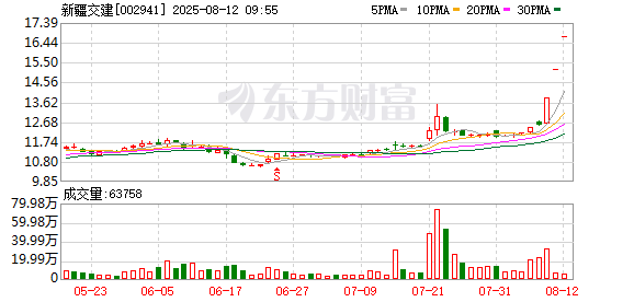 股价表现 - 新疆交建连续3个交易日涨停 累计涨幅达33.15% 最新股价报16.71元[2] - 涨停板封单金额达11.45亿元 换手率0.24% 成交金额2555.81万元[2] - 连续涨停期间累计换手率为6.49% 最新A股总市值107.88亿元[2] 资金动向 - 融资余额2.53亿元 较前日增加2035.52万元 环比增长8.75%[2] - 近3日融资余额累计增加462.96万元 环比增长1.86%[2] - 龙虎榜显示机构净卖出1626.25万元 深股通累计净卖出797.46万元[2] - 营业部席位合计净买入6426.92万元[2] 股东结构 - 最新股东户数43616户 较上期减少4174户 环比下降8.73%[2] 财务表现 - 一季度营业总收入4.35亿元 同比增长9.18%[3] - 一季度净利润-740.64万元 同比增长43.64%[3] - 上半年预计净利润2.05亿元至3.05亿元 同比增幅185.97%至325.47%[3] 近期交易数据 - 8月11日主力资金净流入6381.47万元 换手率1.19% 涨幅9.99%[3] - 8月8日主力资金净流入18168.91万元 换手率5.06% 涨幅10.04%[3] - 8月7日主力资金净流入1128.97万元 换手率3.67% 涨幅0.97%[3]