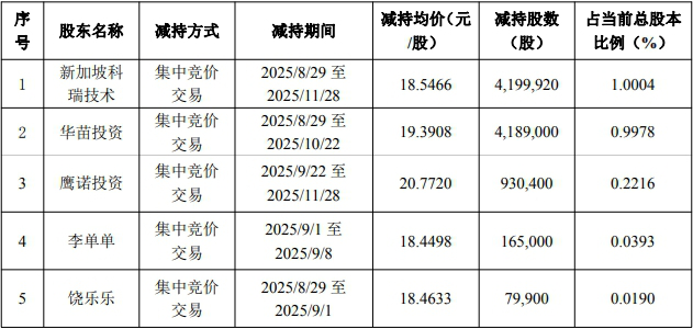 减持计划执行情况总结 - 公司控股股东、持股5%以上股东及部分高级管理人员股份减持计划期限届满 减持主体包括新加坡科瑞技术 华苗投资 鹰诺投资 高级管理人员李单单和饶乐乐[1] - 新加坡科瑞技术于2025年8月29日至11月28日期间 通过集中竞价减持4,199,920股 占公司总股本1.0004% 减持均价18.5466元/股[2][3] - 华苗投资于2025年8月29日至10月22日期间 通过集中竞价减持4,189,000股 占公司总股本0.9978% 减持均价19.3908元/股[2][3] - 鹰诺投资于2025年9月22日至11月28日期间 通过集中竞价减持930,400股 占公司总股本0.2216% 减持均价20.7720元/股[2][3] - 高级管理人员李单单于2025年9月1日至9月8日期间 通过集中竞价减持165,000股 占公司总股本0.0393% 减持均价18.4498元/股[2][3] - 高级管理人员饶乐乐于2025年8月29日至9月1日期间 通过集中竞价减持79,900股 占公司总股本0.0190% 减持均价18.4633元/股[2][3] - 上述股东在2025年8月29日至11月28日期间 合计减持9,564,220股 合计减持金额达1.83亿元[3] 控股股东历史减持与公司背景 - 新加坡科瑞技术为公司控股股东 实际控制人为潘利明(新加坡国籍)[4] - 控股股东新加坡科瑞技术自2022年9月9日起开始减持 截至2025年6月21日 已累计减持1,670.54万股 累计套现约3.04亿元[4] - 公司于2019年7月26日在深交所上市 发行4,100万股 发行价格每股15.10元 募集资金总额6.19亿元 募集资金净额5.66亿元[4] - 上市募集资金用于中山科瑞自动化技术有限公司自动化设备及配套建设项目 自动化装备及配套建设项目 技术中心升级改造项目 信息化系统建设项目[4] - 公司上市保荐机构为国海证券 保荐代表人为许超 关建宇 发行费用总计5,332.47万元 其中支付给国海证券的承销及保荐费用为3,881.13万元[4] 公司再融资情况 - 公司于2025年3月6日发布2024年度以简易程序向特定对象发行股票上市公告书[5] - 该次发行价格为12.12元/股 募集资金总额为111,749,987.52元 扣除发行费用5,966,981.13元后 募集资金净额为105,783,006.39元[5] - 该次发行的保荐机构为长江保荐 认购资金总额111,749,987.52元已于2025年2月24日汇入指定账户[5][6] - 公司首次公开发行与2024年度定向发行两次募资 金额共计7.31亿元[6]