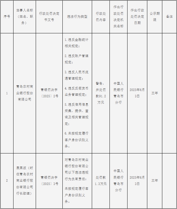 行政处罚决定 - 青岛农村商业银行股份有限公司因多项违规行为被中国人民银行青岛市分行处以警告并罚款91.2万元 [1] - 违规行为包括违反金融统计相关规定、违反账户管理规定、违反人民币流通管理规定、违反反假货币业务管理规定、违反信用信息采集、提供、查询及相关管理规定、未按规定履行客户身份识别义务 [1] - 时任青岛农村商业银行股份有限公司行长助理袁某波因对未按规定履行客户身份识别义务负有责任被罚款1.3万元 [1] - 行政处罚决定书文号分别为青银罚决字〔2025〕2号和青银罚决字〔2025〕3号 [1] - 行政处罚决定日期为2025年6月3日 [1] - 公示期为三年 [1]