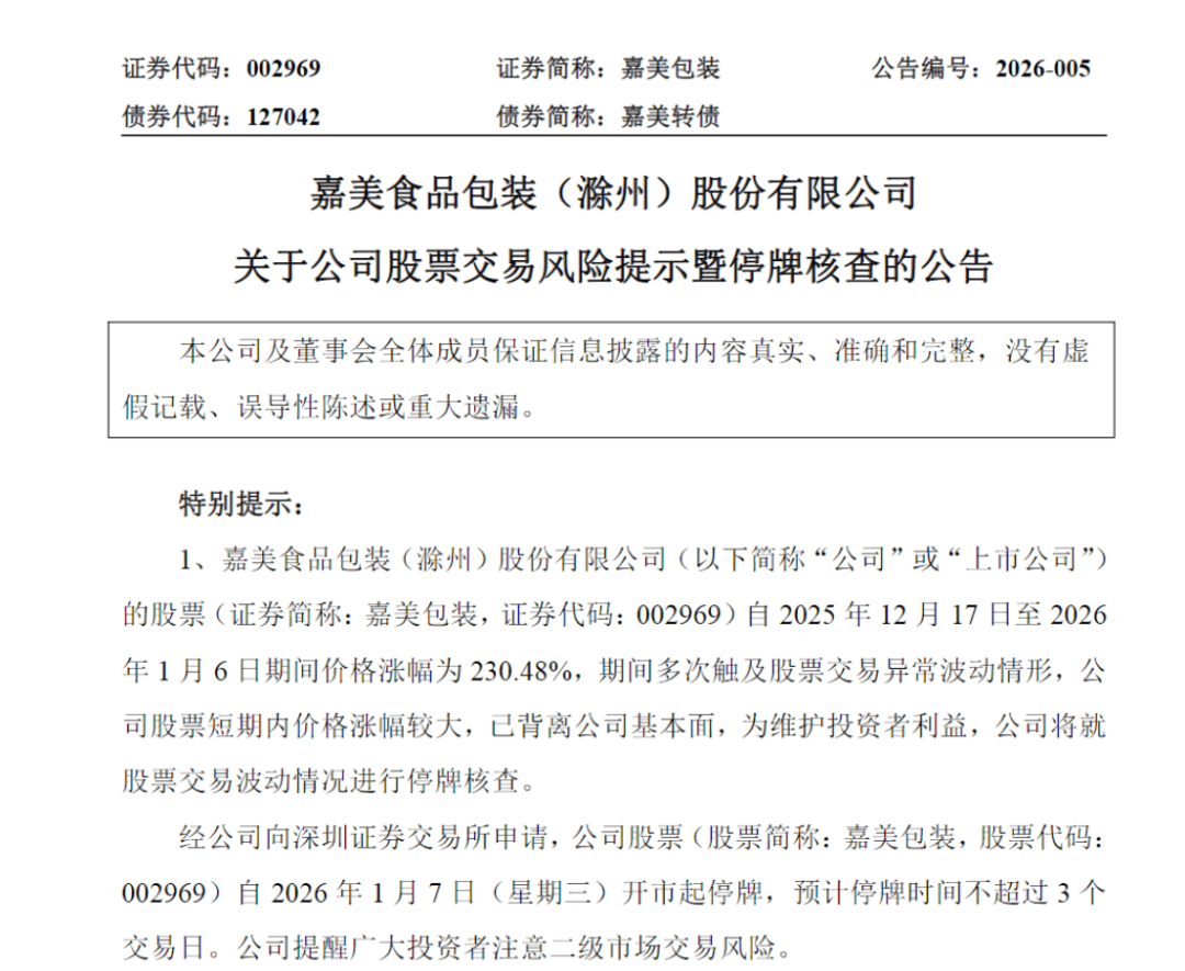 核心观点 - 嘉美包装与国晟科技因短期股价涨幅巨大、严重偏离基本面而停牌核查 [1][3][6] - 两家公司股价暴涨均由重大事件驱动 但事件本身存在不确定性 且公司当前基本面表现疲弱 [3][4][6] 嘉美包装 - 公司股票将于2026年1月7日起停牌核查 预计停牌时间不超过3个交易日 [1][3] - 自2025年12月17日至2026年1月6日 13个交易日内收获11个涨停 累计涨幅达230.48% 市值已超140亿元 [1] - 股价暴涨由控制权变更事项引爆 控股股东拟转让2.79亿股(占总股本29.9%)并放弃剩余表决权 新控股股东或其关联方拟进一步要约收购2.33亿股(占总股本25%) 交易完成后实控人将变更为追觅科技创始人俞浩 [3] - 控制权变更事项尚需履行系列决策、报批程序 能否最终完成及完成时间存在不确定性 [3] - 2025年前三季度营业收入20.39亿元 同比下降1.94% 净利润3916.02万元 同比下降47.25% [4] 国晟科技 - 公司股票将于2026年1月7日起停牌核查 预计停牌时间不超过3个交易日 [1][6] - 自2025年10月31日至2026年1月6日期间累计涨幅高达370.2% 其间多次触及股价异常波动 [4][6] - 股价上涨由跨界投资锂电领域消息催动 包括计划以2.3亿元增资建设固态电池项目 以及拟以2.4亿元收购锂电池结构件公司孚悦科技100%股权 [6] - 当前并购事项尚未最终完成 [6] - 公司当前主业为异质结光伏电池 2025年前三季度营收4.5亿元 同比下滑57.79% 净利润亏损1.51亿元 [6]