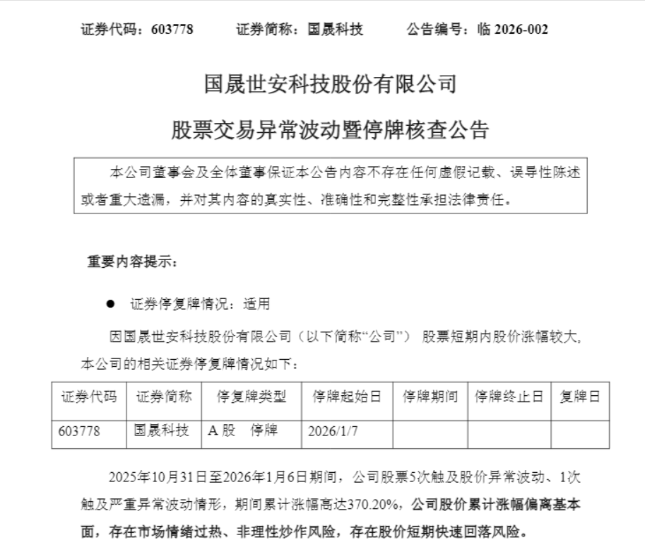 国晟科技停牌核查 - 公司股票将于2026年1月7日起停牌核查,预计停牌时间不超过3个交易日 [2] - 2025年10月31日至2026年1月6日期间,公司股价累计涨幅高达370.20% [2] - 自2025年10月15日至2026年1月6日的58个交易日内,公司股价累计涨幅达494.97%,期间收获41根“阳线” [3] - 截至1月6日收盘,公司股价报21.3元,总市值140亿元,全天成交11.33亿元,换手率8.51% [4] - 公司股价自2024年4月9日的历史低点至今反弹幅度超755% [4] - 公司最新市净率为17.47,显著高于所属电气机械和器材制造业的行业平均市净率3.22 [2][6] - 公司主营业务未发生变化,目前从事大尺寸高效异质结光伏电池及组件的研发、生产与销售 [2][7] - 2025年前三季度,公司实现归母净利润约-1.51亿元,扣非归母净利润约-1.52亿元,处于亏损状态 [2] - 2020年至2024年,公司扣非净利润已连续5年为负值 [6] - 公司对外投资存在不确定性,包括投资国晟环球新能源(铁岭)有限公司及收购铜陵市孚悦科技有限公司100%股权等项目 [3] - 公司控股股东累计质押股份8650万股,占其持股数量的79.87%,占公司总股本的13.17% [3] - 2025年10月16日以来,公司已累计发布11份异动或风险提示公告 [6] 嘉美包装停牌核查 - 公司股票自2026年1月7日起停牌核查,预计停牌时间不超过3个交易日 [8] - 2025年12月17日至2026年1月6日期间,公司股价涨幅为230.48% [8] - 公司在近16个交易日收获12个涨停板,其中包括复牌后的10个一字板涨停 [9] - 截至1月6日收盘,公司股价报收15.07元/股,总市值148亿元 [9] - 公司市盈率和市净率与同行业有较大差异 [8] - 公司控股股东与苏州逐越鸿智科技发展合伙企业签署股份转让协议,可能导致公司控股股东及实际控制人发生变更,但相关事项存在不确定性 [8] - 苏州逐越鸿智科技发展合伙企业成立于2025年9月,注册资本200万人民币,从事科技推广和应用服务业 [8] - 公司主营业务是食品饮料包装容器的研发、设计、生产和销售及提供饮料灌装服务,主要产品包括三片罐、二片罐和无菌纸包装 [12] - 2025年前三季度,公司净利润为3916.02万元,同比下降47.25%,扣非净利润为3524.43万元,同比下降51.94% [12]