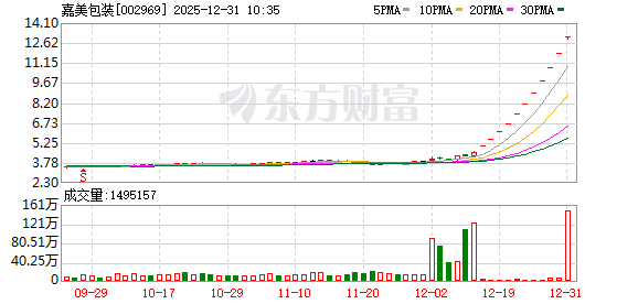股价表现与交易数据 - 嘉美包装股价于盘中涨停,已连续收获11个涨停板,截至当日9:25,股价报13.04元 [2] - 连续涨停期间,该股累计涨幅达185.96%,累计换手率为5.34% [2] - 当日换手率为1.02%,成交量972.97万股,成交金额1.27亿元,涨停板封单金额为9.40亿元 [2] 市值与资金流向 - 公司最新A股总市值达到124.59亿元,A股流通市值为123.79亿元 [2] - 龙虎榜数据显示,该股因连续三个交易日内涨幅偏离值累计达20%而上榜4次,买卖居前营业部中,机构净卖出1384.69万元,营业部席位合计净买入1.59亿元 [2] - 根据近日表现表格数据,在连续涨停的多个交易日中,主力资金均呈净流入状态,例如2025年12月29日净流入6730.33万元,12月30日净流入4800.58万元 [2]