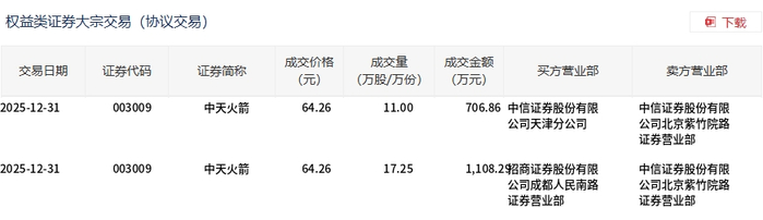 | 交易日期 | 证券代码 | 证券简称 | 成交价格 | 成交量 | 成交金额 买方营业部 (万元) | 卖方营业部 | | --- | --- | --- | --- | --- | --- | --- | | | | | (元) | (万股/万份) | | | | 2025-12-31 | 003009 | 中天火箭 | 64.26 | 11.00 | 706.86 中信证券股份有限 | 中信证券股份有限 | | | | | | | 公司天津分公司 | 公司北京繁竹院路 | | | | | | | | 证券量业部 | | 2025-12-31 | 003009 | 中天火箭 | 64.26 | 17.25 | 1,108.2 貂商证券股份有限 | 中信证券股份有限 | | | | | | | 公司成都人民南路 | 公司北京素竹院路 | | | | | | | 证券营业部 | 证券量不出 | 12月31日,中天火箭大宗交易成交28.25万股,成交额1815.15万元,占当日总成交额的1.26%,成交价 64.26元,较市场收盘价78.54元折价18.18%。 ...