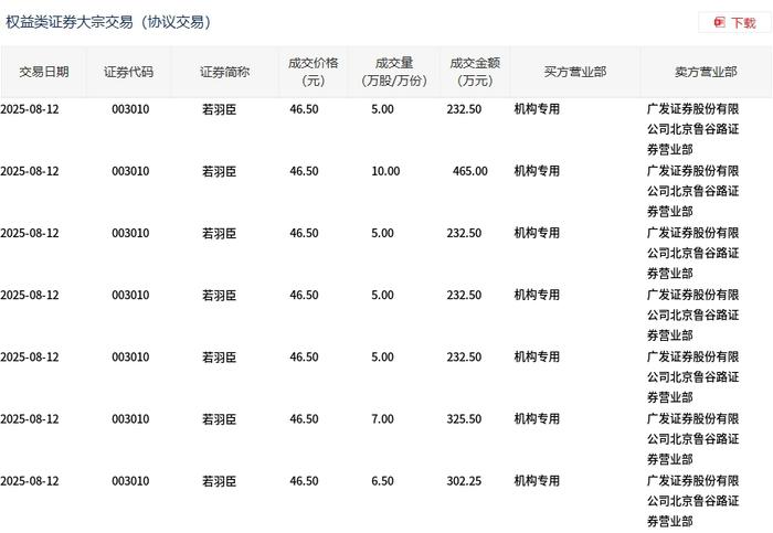 大宗交易概况 - 8月12日若羽臣发生大宗交易,总成交量43.5万股,总成交额2022.75万元,占当日总成交额的4.34% [1] - 成交均价46.5元,较当日收盘价51.98元折价10.54% [1] 交易明细分析 - 共发生7笔大宗交易,单笔成交量5万-10万股,单笔成交金额232.5万-465万元 [2] - 所有买方均为"机构专用"席位,卖方均为广发证券北京鲁谷路证券营业部及其关联席位 [2] - 最大单笔成交量为10万股,成交金额465万元 [2] - 最小单笔成交量为5万股,成交金额232.5万元 [2] 价格与流动性 - 全部交易均以固定价格46.5元成交,显示买卖双方对定价达成一致 [1][2] - 大宗交易成交量占当日总成交额比重达4.34%,显示该交易对当日流动性有显著影响 [1]