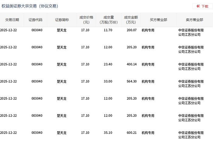 | 交易日期 | 证券代码 | 证券简称 | 成交价格 | 成交量 | 成交金额 | 买方营业部 | 卖方营业部 | | --- | --- | --- | --- | --- | --- | --- | --- | | | | | (元) | (万股/万份) | (万元) | | | | 2025-12-16 | 003040 | 楚天龙 | 16.39 | 21.00 | 344.19 | 方正证券股份有限 | 中信证券股份有限 | | | | | | | | 公司昆明三市街证 | 公司江苏分公司 | | | | | | | | 券营业部 | | | 2025-12-16 | 003040 | 楚天龙 | 16.39 | 12.50 | 204.88 | 机构专用 | 中信证券股份有限 | | | | | | | | | 公司江苏分公司 | | 2025-12-16 | 003040 | 楚天龙 | 16.39 | 16.50 | 270.44 | 机构专用 | 中信证券股份有限 | | | | | | | | | 公司江苏分公司 | | 2025-12-16 | 003040 | 楚天龙 | 16.39 ...