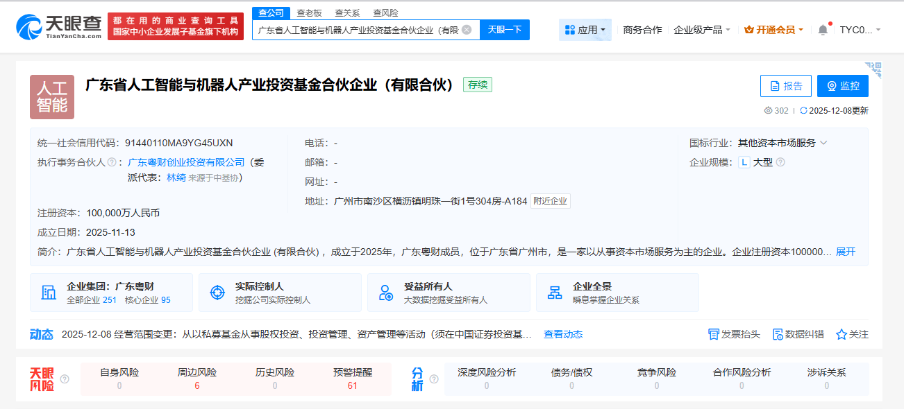 广东省设立人工智能与机器人产业子基金集群 - 广东省产业发展投资基金出资组建百亿规模的人工智能与机器人产业子基金集群 首阶段已完成30亿元子基金的注册成立 [1] - 该百亿规模子基金集群旨在专项服务人工智能与机器人产业体系构建 为核心技术攻关到应用场景提供金融支撑 [1] - 基金集群采用“创投+产投”双轮驱动模式 首阶段布局了一只10亿元创业投资基金和一只20亿元产业投资基金 分别侧重早期技术创新应用和成长期产业化加速 [1] 创业投资基金详情 - 创业投资基金名为“广东省人工智能与机器人产业投资基金” 规模10亿元 注册在广州南沙区 [2] - 基金管理人为广东粤财创业投资有限公司 引入了云天励飞提供技术支撑 南沙科金控股集团提供产业孵化服务 [2] - 该基金将聚焦投资人工智能核心算法、芯片、机器人关键技术创新以及人工智能技术在机器人、低空飞行器等智能终端的创新应用 [2] - 根据天眼查信息 该基金成立于2025年11月13日 注册资本10亿元人民币 广东省产业发展投资基金合伙企业(有限合伙)是其最大合伙人 出资比例为49% [3] 产业投资基金详情 - 产业投资基金名为“广东粤财工融人工智能与机器人产业投资基金” 规模20亿元 [1][5] - 该基金将依托欧菲光等硬核科技产业集聚优势 以建设国家人工智能应用中试基地为牵引 重点投资支持新型智能终端产业化和工业垂直领域模型应用创新 [4] - 根据天眼查信息 该基金成立于2025年12月17日 注册在广东省东莞市 注册资本20亿元人民币 [5] - 主要合伙人包括工银金融资产投资有限公司、工银资本管理有限公司、广东省产业发展投资基金合伙企业(有限合伙)等 [5]