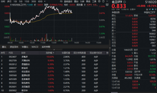 化工板块今日(12月23日)继续猛攻,反映化工板块整体走势的化工ETF(516020)早盘低位震荡后突然拉升,盘中场内价格最高涨幅达到 1.33%,截至发稿,涨0.73%。 成份股方面,氟化工、锂电等板块部分个股涨幅居前。截至发稿,多氟多、天赐材料双双涨停,恩捷股份大涨超6%,新宙邦涨超5%,宏达股 份、星源材质涨超2%。 | 分时 多日 1分 5分 | | | 15分 30分 ୧୦સ | | | F9 盘前盘后 叠加 九转 画线 工具 & 2 > | | | | CD | 516020 | | --- | --- | --- | --- | --- | --- | --- | --- | --- | --- | --- | --- | | 0.838 | | | 13:48 6 0.833 | ANNA | * 0.006(0.73%) 均价 0.833 成交量 0 IOPV 0.8. | | | | (0): 3 3 SSE CNY 13:48:16 交易中 | | +0.006 +0.73% 中 / @ + | | 0:833 | | | | | | | | 0.6798 | 净值走势 | | 华宝化工 ...