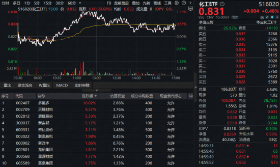 炒股就看金麒麟分析师研报,权威,专业,及时,全面,助您挖掘潜力主题机会! 化工板块今日(12月23日)继续猛攻,反映化工板块整体走势的化工ETF(516020)早盘低位震荡后突 然拉升,盘中场内价格最高涨幅达到1.33%,截至发稿,涨0.73%。 成份股方面,氟化工、锂电等板块部分个股涨幅居前。截至发稿,多氟多、天赐材料双双涨停,恩捷股 份大涨超6%,新宙邦涨超5%,宏达股份、星源材质涨超2%。 | 分时 多日 1分 5分 15分 30分 60分 ▼ | F9 盘前盘后 雪加 九转 画线 工具 @ CO | 516020 | 4. TETS (D | 516020(化工ETF) 13:48 价 0.833 涨跌 0.006(0.73%) 均价 0.833 股交量 0 IOPV 0.8 | 0.833 | +0.006 +0.73% | 0.83 | Varmon | | | | | | | | | | | | | | --- | --- | --- | --- | --- | --- | --- | --- | --- | --- | --- | --- | --- | --- | --- | --- | - ...