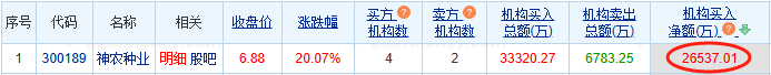 格隆汇12月10日|神农种业(300189.SZ)今日20CM涨停,换手率51.33%,成交额29.1亿元。龙虎榜数据显示,四家机构买入3.33亿元,卖出6783万元,净买 入2.65亿元;游资"量化打板"位列买五席位,净买入4258万元。上榜席位全天买入4.06亿元,卖出1.76亿元,合计净买入2.3亿元。(格隆汇) | 买入 金额最大的 前5 | | --- | | 5 -1 | | 序号 | 交易营业部名称 | | 买入金额(万) | 占息成交比例 | | --- | --- | --- | --- | --- | | | 机构专用 | 1538次 42.33% | 11458.26 | 3.90% | | 2 | easimoney.com 机构专用 | 1538次 42.33% | 10766.38 | 3.66% | | 3 | 机构专用 | 1538次 42.33% | 5992.93 | 2.04% | | 4 | 机构专用 | 1538次 42.33% | 5102.69 | 1.74% | | 5 | 开源证券股份有限公司西安西大街证券营业部 | 690次 50.29% | 4282.99 ...