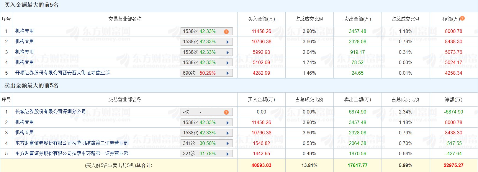 | 买入金额最大的前5名 | | | | | | | | | --- | --- | --- | --- | --- | --- | --- | --- | | 序号 | 交易营业部名称 | | | 买入金额(万) | 占总成交比例 | 卖出金额(万) | 占总成交比例 | | 1 | 机构专用 | 1538次 42.33% | 2 | 11458.26 | 3.90% | 3457.48 | 1.18% | | 2 | 机构专用 | 1538次 42.33% | | 10766.38 | 3.66% | 2328.08 | 0.79% | | ന | 机构专用 | 1538次 42.33% | | 5992.93 | 2.04% | 919.17 | 0.31% | | র্ম | 机构专用 | 1538次 42.33% | | 5102.69 | 1.74% | 78.52 | 0.03% | | રે | 开源证券股份有限公司西安西大街证券营业部 | 690次 50.29% | | 4282.99 | 1.46% | 24.65 | 0.01% | | | 卖出金额最大的前5名 | | | | | | ...