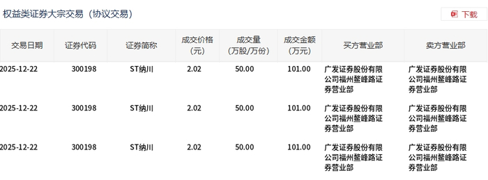 | 交易日期 | 证券代码 | 证券简称 | 成交价格 | 成交量 | 成交全额 | 买方营业部 | 卖方营业部 | | --- | --- | --- | --- | --- | --- | --- | --- | | | | | (元) | (万股/万份) | (万元) | | | | 2025-12-22 | 300198 | ST纳川 | 2.02 | 50.00 | 101.00 | 广发证券股份有限 | 广发证券股份有限 | | | | | | | | 公司福州餐隆路证 | 公司福州容隆路址 | | | | | | | | 券营业部 | 劳营业部 | | 2025-12-22 | 300198 | ST纳川 | 2.02 | 50.00 | 101.00 | 广发证券股份有限 | 广发证券股份有限 | | | | | | | | 公司福州签峰路证 | 公司福州签峰路证 | | | | | | | | 券营业部 | 券营业部 | | 2025-12-22 | 300198 | ST纳川 | 2.02 | 50.00 | 101.00 | 广发证券股份有限 | 广发证券股份有限 | | | | | | ...