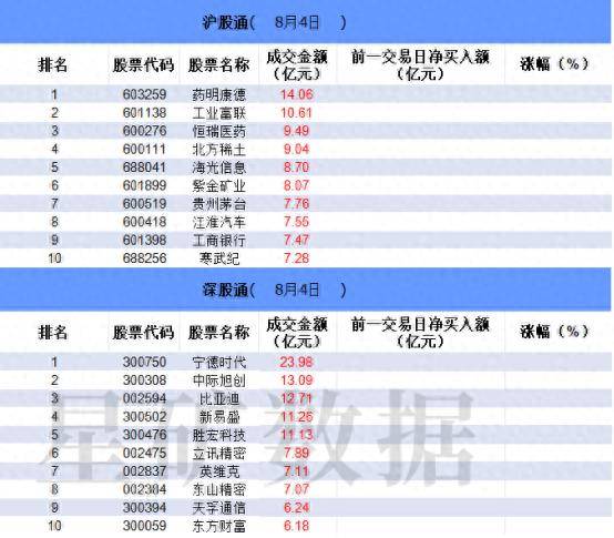 市场表现 - 8月4日上证指数上涨0.66%,深证成指上涨0.46%,创业板指上涨0.5% [1] - 49只个股登上龙虎榜,其中26只净买入,23只净卖出 [1][4] - 翰宇药业(300199.SZ)资金净流入最多,达5.45亿元,占总成交金额11.63%,收盘上涨19.98%,换手率29.65% [1][2] - 巨人网络(002558.SZ)资金净流出最多,达2.07亿元,占总成交金额9.15%,收盘上涨9.99%,换手率4.52% [2][4] 机构资金动向 - 30只个股龙虎榜出现机构身影,合计净买入2.55亿元,其中17股净买入,13股净卖出 [4] - 机构净买入金额最多的是建设工业(002265.SZ),净买入1.41亿元,收盘上涨9.99%,换手率20.51% [5][12] - 机构净卖出金额最多的是巨人网络(002558.SZ),净卖出1.50亿元,占总成交金额6.63% [7][12] 北向资金动向 - 北向资金参与13只龙虎榜个股,合计净买入4.04亿元,其中沪股通净买入1.16亿元,深股通净买入2.88亿元 [8] - 北向资金净买入金额最多的是翰宇药业(300199.SZ),净买入2.33亿元,占总成交金额4.98% [8] - 北向资金净卖出金额最多的是巨人网络(002558.SZ),净卖出1.76亿元,占总成交金额7.78% [8] 机构与北向资金联动 - 机构和北向资金共同净买入建设工业,合计净买入3.58亿元,占总成交金额11.01% [10][12] - 共同净卖出山河智能和巨人网络,其中巨人网络合计净卖出3.26亿元,占总成交金额14.41% [10][12] - 在翰宇药业、江海股份、共创草坪上出现分歧:机构净卖出翰宇药业346万元,北向净买入2.33亿元;机构净卖出江海股份7112万元,北向净买入3132万元;机构净买入共创草坪6312万元,北向净卖出1125万元 [10][12]