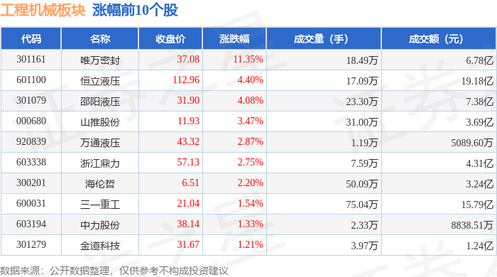 证券之星消息,12月30日工程机械板块较上一交易日上涨1.69%,唯万密封领涨。当日上证指数报收于 3965.12,下跌0.0%。深证成指报收于13604.07,上涨0.49%。工程机械板块个股涨跌见下表: | 代码 | 名称 | 收盘价 | 涨跌幅 | 成交量(手) | 成交额(元) | | --- | --- | --- | --- | --- | --- | | 301161 | 唯万密封 | 37.08 | 11.35% | 18.49万 | 6.78亿 | | 601100 | 恒立液压 | 112.96 | 4.40% | 17.09万 | 19.18亿 | | 301079 | 邵阳液压 | 31.90 | 4.08% | 23.30万 | 7.38亿 | | 000680 | 山推股份 | 11.93 | 3.47% | 31.00万 | 3.69亿 | | 920839 | 万通液压 | 43.32 | 2.87% | 1.19万 | 5089.60万 | | 603338 | 浙江鼎力 | 57.13 | 2.75% | 7.59万 | 4.31亿 | | 300201 | 海伦哲 | 6 ...
