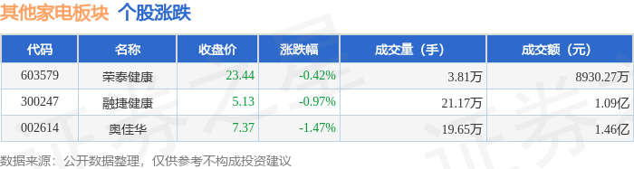 证券之星消息,12月30日其他家电板块较上一交易日下跌0.89%,奥佳华领跌。当日上证指数报收于 3965.12,下跌0.0%。深证成指报收于13604.07,上涨0.49%。其他家电板块个股涨跌见下表: | 代码 | | | 名称 主力净流入(元) 主力净占比 游资净流入(元) 游资净占比 散户净流)(元) 散户净占比 | | | | | --- | --- | --- | --- | --- | --- | --- | | 603579 荣泰健康 | 181.82万 | 2.04% | 117.73万 | 1.32% | -299.55万 | -3.35% | | 300247 融捷健康 | -446.38万 | -4.08% | 156.52万 | 1.43% | 289.86万 | 2.65% | | 002614 | -986.65万 | -6.76% | -723.89万 | -4.96% | 1710.55万 | 11.72% | 以上内容为证券之星据公开信息整理,由AI算法生成(网信算备310104345710301240019号),不构成投资建议。 从资金流向上来看,当日其他家电板块主力资金 ...