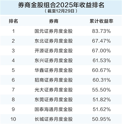 来源:证券时报 作者:许盈 | | 券商金股组合2025年收益排名 | | | --- | --- | --- | | | (截至12月29日) | | | 排名 | 存商 | 累计收益率 | | 1 | 国元证券月度金股 | 83.73% | | 2 | 东北证券月度金股 | 67.47% | | 3 | 开源证券月度金股 | 67.00% | | ব | 东兴证券月度金股 | 61.53% | | 5 | 华鑫证券月度金股 | 60.67% | | 6 | 招商证券月度金股 | 60.31% | | 7 | 光大证券月度金股 | 55.50% | | 8 | 东莞证券月度金股 | 51.82% | | ਰੇ | 国泰海通月度金股 | 51.62% | | 10 | 长城证券月度金股 | 50.95% | 证券时报记者 许盈 每市APP显示,截至12月29日收盘,共有10家券商推荐的金股组合年内录得了超过50%(收益率计算规 则:将券商推荐的月度金股等权编制成指数,每月调仓)的收益率。 具体来看,来自国元证券的金股组合收益率最高,为83.73%;东北证券、开源证券的金股组合以 67.47%、67%的收益率分 ...