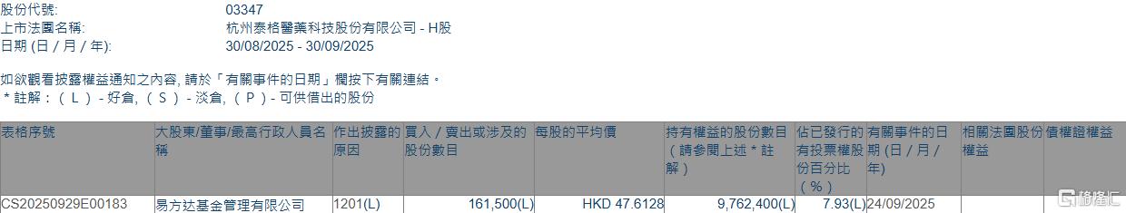 格隆汇9月30日丨根据联交所最新权益披露资料显示,2025年9月24日,泰格医药(03347.HK)遭易方达基金管理有限公司在场内以每股均价47.6128港元减持 16.15万股,涉资约768.95万港元。 减持后,易方达基金管理有限公司最新持股数目为976.24万股,持股比例由8.06%下降至7.93%。 | 股份代號: | 03347 | | --- | --- | | 上市法國名稱: | 杭州泰格醫藥科技股份有限公司 - H股 | | 日期 (日 / 月 / 年): | 30/08/2025 - 30/09/2025 | | 表格序號 | 大股東/董事/最高行政人員名 作出披露的 買入 / 費出或涉及的 每股的平均價 | | | | | 持有權益的股份數目 佔已發行的 有關事件的日 相關法 | | | --- | --- | --- | --- | --- | --- | --- | --- | | | 期 | 原因 | 股份數目 | | | ( 請參閱上述 * 註 有投票權股 期 (日 / 月 / | | | | | | | | | 陆 | 份自分比 年) | | | | | | | | | ( % ...