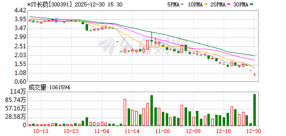 截至12月30日收盘,*ST长药的股价报0.95元/股,下跌19.49%,总市值约3亿元。 12月30日晚间,长江医药控股股份有限公司(以下简称*ST长药,300391.SZ)发布公告称,公司股票 收盘价首次低于1元,可能因连续二十个交易日股票收盘价低于1元而被终止上市。同时,公司因涉嫌定 期报告等财务数据虚假记载被证监会立案调查,可能触及重大违法强制退市情形。 此外,*ST长药2024年度期末净资产为负,若2025年度期末净资产继续为负,将被实施财务类强制退 市。公司还面临诉讼、仲裁案件风险,大额有息负债逾期风险,账户冻结风险以及大额欠税风险。 公告显示,12月26日,*ST长药收到中国证监会下发的《行政处罚事先告知书》,认定公司2021年、 2022年、2023年的年度报告存在虚假记载。 12月29日晚间,*ST长药发布公告称,收到十堰中院送达的《民事裁定书》和《决定书》,法院裁定不 予受理十堰市郧胥工贸有限公司对公司的重整申请,决定依法终结公司预重整程序。法院认为,依照相 关规定,长药控股在预重整期间未能提交预重整方案,明显缺乏重整可行性。同日,公司收到另一份法 院的《民事裁定书》,裁定终止*ST长药的 ...