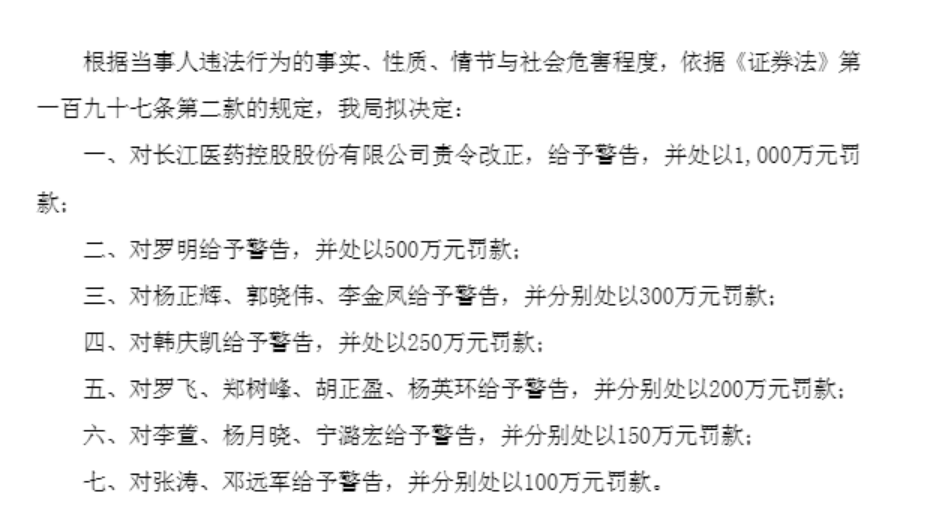 严重财务造假案件,监管通报来了! 12月26日,"证监会发布"显示,证监会严肃查处长药控股严重财务造假案件。 近日,证监会对上市公司长江医药控股股份有限公司(简称*ST长药)涉嫌定期报告等财务数据存在虚假记载作出行政处罚事先告知。 经查,*ST长药连续三年虚增收入和利润,违反证券法律法规。证监会拟对上市公司罚款1000万元,对14名责任人合计罚款3100万元,对公司原总经理罗 明采取终身证券市场禁入措施。 *ST长药涉嫌触及重大违法强制退市情形,深交所将依法启动退市程序。证监会对中介机构执业情况同步开展核查,一旦发现违法违规情形,将依法予以 惩处。 证监会表示,对于可能涉及的犯罪线索,将坚持应移尽移的工作原则,严格按照《刑法》《最高人民检察院公安部关于公安机关管辖的刑事案件立案追诉 标准的规定(二)》的规定移送公安机关。 据介绍,*ST长药是今年以来沪深两市第15家因财务造假而涉嫌触及重大违法强制退市的公司。 连续三年财务造假 12月26日晚间,*ST长药披露了证监会下发的《行政处罚事先告知书》,公布其涉嫌违法的具体事实。 据悉,2020年11月,*ST长药通过支付现金方式收购湖北长江星医药股份有限公司(以下 ...