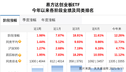 易方达创业板ETF表现 - 今年以来收益率达12.26%,在同类3355只基金中排名1335位 [1] - 近1周涨幅1.98%,近1月涨幅7.87%,近3月涨幅18.91%,均超越同类平均水平和沪深300指数 [2] - 近6月涨幅11.61%,今年来涨幅12.27%,跟踪标的涨幅11.12% [2] 基金经理信息 - 基金经理成曦累计任职时间9年又98天,管理基金资产总规模1953.79亿元,在管基金最佳任期回报56.15% [4] - 基金经理刘树荣累计任职时间8年又26天,管理基金资产总规模1122.99亿元,在管基金最佳任期回报96.37% [6] - 成曦现任多只指数基金基金经理,包括易方达深证100ETF、创业板ETF等产品 [3] - 刘树荣同时管理易方达深证100ETF、创业板ETF及多只主题指数基金 [4][5] 基金公司股权结构 - 易方达基金第一大股东盈峰集团、广东粤财信托、广发证券均持股22.65% [6] - 广东省广晟控股集团持股15.10%,广州市广永国资持股7.55% [6] - 其余6家合伙企业股东合计持股9.4%,股权结构相对分散 [6] 投资运作动态 - 易方达创业板ETF出现在菲利华前十大股东名单中,且在二季度进行减持操作 [1] - 刘树荣管理的易方达中证港股通消费主题ETF规模6.37亿元,自2025年4月11日任职以来回报11.26% [6]