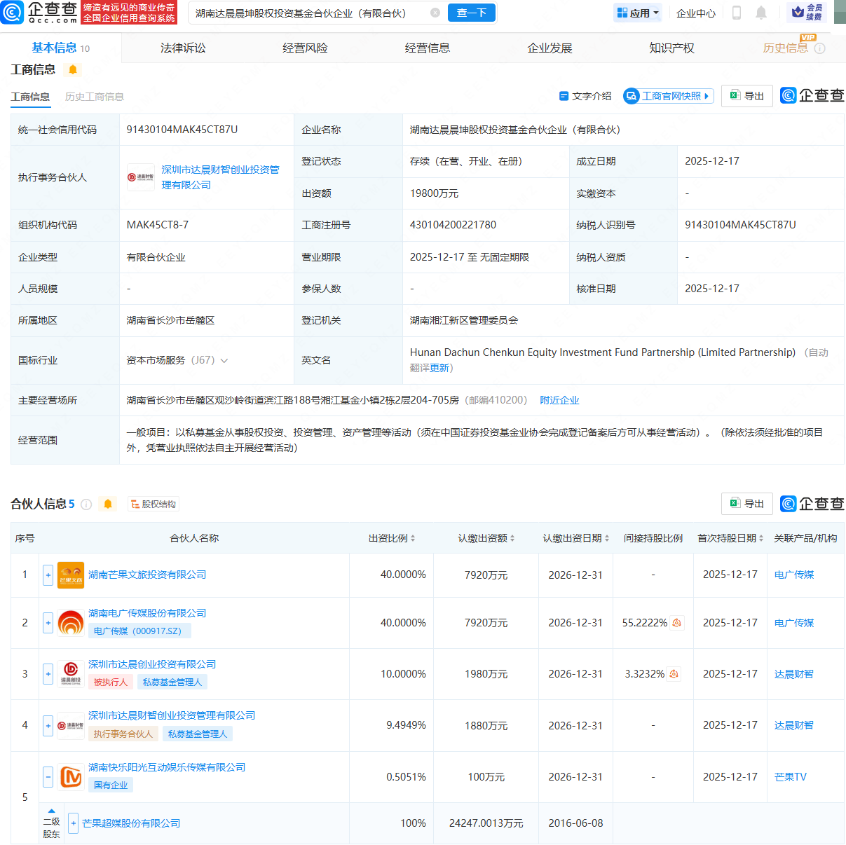 | 序号 | | 合伙人名称 | 出资比例 ÷ | 认缴出资额 ÷ | 认缴出资日期 ÷ | 间接持股比例 | 首次持股日期 ÷ | | --- | --- | --- | --- | --- | --- | --- | --- | | | | 湖南芒果文旅投资有限公司 | 40.0000% | 7920万元 | 2026-12-31 | - | 2025-12-17 | | 2 | | 湖南电广传媒股份有限公司 电广传媒 (000917.SZ) | 40.0000% | 7920万元 | 2026-12-31 | 55.2222% | 2025-12-17 | | 3 | O | 深圳市达晨创业投资有限公司 被执行人 私募基金管理人 | 10.0000% | 1980万元 | 2026-12-31 | 3.3232% @ | 2025-12-17 | | ব | 12 2441 | 深圳市达晨财智创业投资管理有限公司 执行事务合伙人 私募基金管理人 | 9.4949% | 1880万元 | 2026-12-31 | - | 2025-12-17 | | | | 湖南快乐阳光互动娱乐传媒有限公司 国有企业 | ...