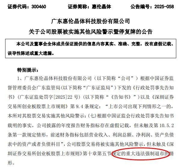 公司股票交易状态变更 - 公司股票交易将被实施其他风险警示 但未触及重大违法强制退市的情形 [1] - 公司股票自2025年12月10日开市起停牌1天 将于2025年12月11日开市起复牌 [1] - 公司股票自2025年12月11日起被实施其他风险警示 股票简称由“惠伦晶体”变更为“ST惠伦” [1]