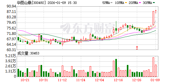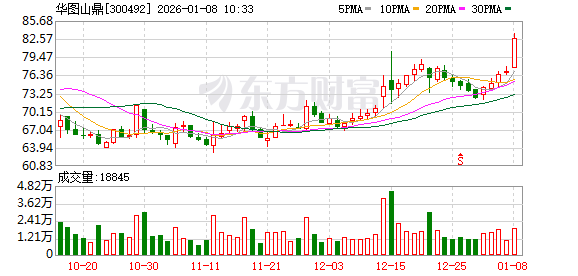 公司发布的三季报数据显示,前三季度公司共实现营业收入24.64亿元,同比增长15.65%,实现净利润 2.49亿元,同比增长92.48%,基本每股收益为1.2700元,加权平均净资产收益率77.57%。(数据宝) (文章来源:证券时报网) 证券时报·数据宝统计显示,华图山鼎所属的建筑装饰行业,目前整体涨幅为1.03%,行业内,目前股价 上涨的有111只,涨停的有志特新材、杭萧钢构等6只。股价下跌的有42只,跌幅居前的有园林股份、中 铝国际、苏文电能等,跌幅分别为3.34%、2.94%、2.63%。 两融数据显示,该股最新(1月7日)两融余额为4.39亿元,其中,融资余额为4.38亿元,近10日增加 2679.91万元,环比增长6.52%。 机构评级来看,近10日共有1家机构对该股进行评级,1月6日国泰海通证券发布的研报给予公司目标价 为89.20元。 华图山鼎股价创出历史新高,截至9:54,该股上涨7.42%,股价报82.65元,成交量130.73万股,成交金 额1.06亿元,换手率0.66%,该股最新A股总市值达162.56亿元,该股A股流通市值162.56亿元。 ...