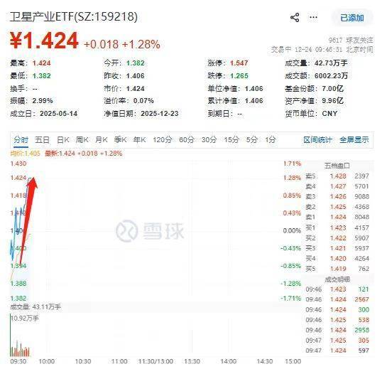 12月24日,卫星板块迅速拉升。数据显示,截至9时47分,表征板块的卫星产业ETF(159218)放量涨 1.35%,成分股新雷能、宏达电子、北斗星通涨幅居前。 分析指出,作为我国第二款首飞即尝试回收的液氧甲烷运载火箭,此次任务为后续相关技术迭代优化积 累了宝贵数据与实践经验,标志着中国航天在低成本进入太空领域迈出关键一步。当前,商业航天已步 入高频次发展期,产业链各环节加速迭代成熟。行业在技术创新中前行,既有突破的期待,也需理性看 待研发过程中的技术挑战。以ETF为代表的市场化工具,正成为投资者在行业高成长与高波动并存背景 下,把握产业长期机遇、平滑个股风险的重要配置选择。 风险提示:基金有风险,投资需谨慎。 | 卫星产业ETF(SZ:159218) | | | | | | | --- | --- | --- | --- | --- | --- | | ¥1.424 +0.018 +1.28% | | | 交易中 12-24 09:46:51 北京时间 | | 9617 球友美注 | | 景高:1.424 | 今年:1.382 | 涨停:1.547 | 成交量:42.73万手 | | | | 最低:1.38 ...