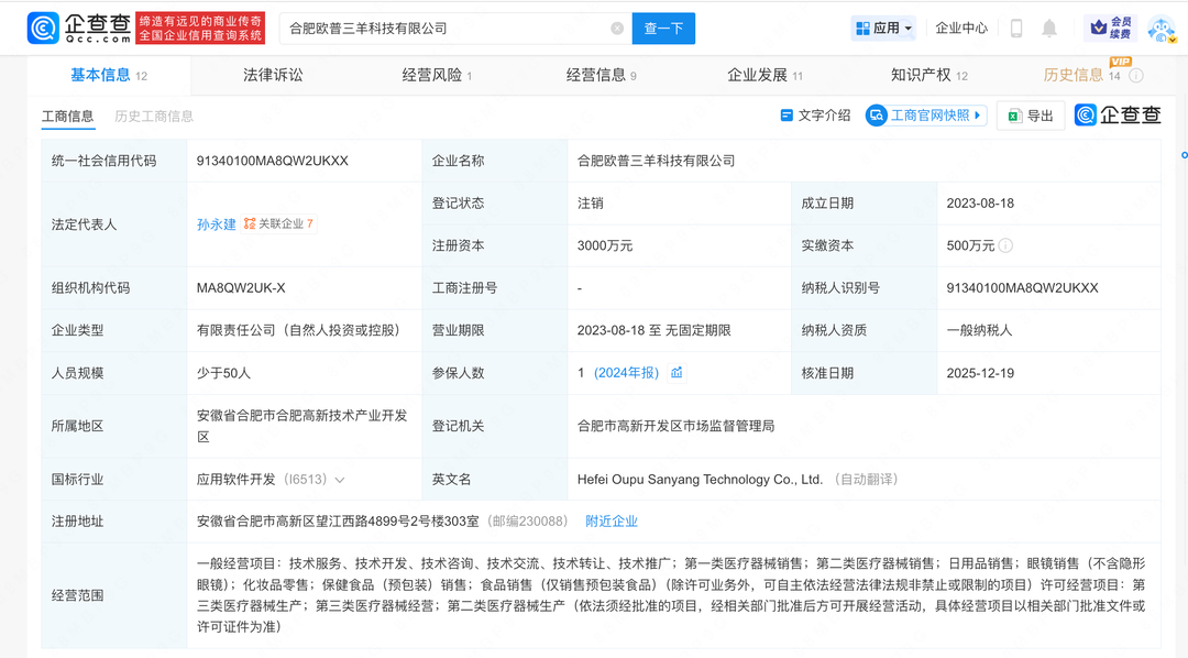 公司工商状态变更 - 合肥欧普三羊科技有限公司的登记状态已由存续变更为注销[1] - 该公司此前已发布简易注销公告[1] - 公司核准注销日期为2025年12月19日[2] 公司基本信息 - 公司成立于2023年8月18日[2] - 公司法定代表人为孙永建[2] - 公司注册资本为3000万元人民币,实缴资本为500万元人民币[2] - 公司注册地址位于安徽省合肥市高新区[2] - 公司人员规模少于50人,2024年报显示参保人数为1人[2] - 公司企业类型为有限责任公司(自然人投资或控股)[2] 股权结构与股东 - 公司由欧普康视、合肥三只羊网络科技有限公司、赵春生共同持股[2] 行业与经营范围 - 公司所属国标行业为应用软件开发(I6513)[2] - 公司经营范围包括技术服务、技术开发、技术咨询等技术服务业务[2] - 公司经营范围涵盖第一类、第二类医疗器械销售,以及第三类医疗器械的生产与经营(需经批准)[2] - 公司经营范围还包括日用品销售、眼镜销售、化妆品零售、保健食品及预包装食品销售等[2]