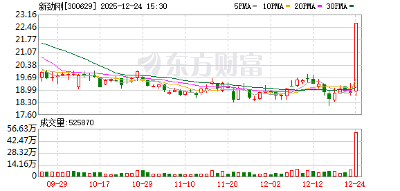 新劲刚今日涨停,全天换手率24.25%,成交额11.29亿元,振幅21.83%。龙虎榜数据显示,机构净买入 2264.94万元,营业部席位合计净买入7321.98万元。 (文章来源:证券时报网) 资金流向方面,今日该股主力资金净流入2.07亿元,其中,特大单净流入2.90亿元,大单资金净流出 8316.83万元。近5日主力资金净流入1.88亿元。 融资融券数据显示,该股最新(12月23日)两融余额为4.67亿元,其中,融资余额为4.67亿元,融券余 额为29.08万元。近5日融资余额合计减少1378.56万元,降幅为2.87%,融券余额合计增加308.00元,增 幅0.11%。(数据宝) 新劲刚12月24日交易公开信息 | 买/卖 | 会员营业部名称 | 买入金额(万元) | 卖出金额(万元) | | --- | --- | --- | --- | | 买一 | 开源证券股份有限公司西安西大街证券营业部 | 6381.51 | 14.96 | | 买二 | 东方证券股份有限公司成都万象南路证券营业部 | 4996.01 | 1.07 | | 买三 | 麦高证券有限责任公司成都丽都路证券营业部 | 4095.8 ...