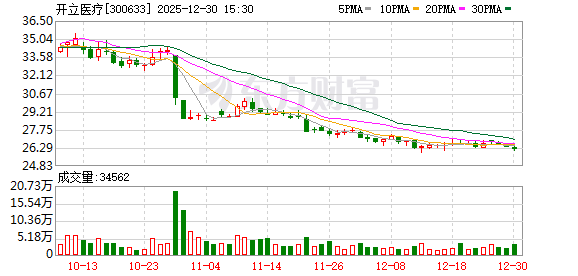 开立医疗2025年三季报显示,前三季度公司主营收入14.59亿元,同比上升4.37%;归母净利润3351.11 万元,同比下降69.25%;扣非净利润2399.1万元,同比下降72.14%;其中2025年第三季度,公司单季度 主营收入4.95亿元,同比上升28.42%;单季度归母净利润-1351.92万元,同比上升78.05%;单季度扣非 净利润-1588.57万元,同比上升76.92%;负债率24.22%,投资收益207.82万元,财务费用-3830.36万 元,毛利率60.36%。开立医疗(300633)主营业务:医疗诊断及治疗设备的自主研发、生产与销售。 证券之星消息,截至2025年12月30日收盘,开立医疗(300633)报收于26.2元,下跌0.49%,换手率 0.8%,成交量3.46万手,成交额9073.33万元。 12月30日的资金流向数据方面,主力资金净流入966.07万元,占总成交额10.65%,游资资金净流出 426.32万元,占总成交额4.7%,散户资金净流出539.76万元,占总成交额5.95%。 近5日资金流向一览见下表: 该股主要指标及行业内排名如下: 该股最近90天内共有11家机 ...