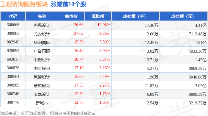 从资金流向上来看,当日工程咨询服务板块主力资金净流出1.04亿元,游资资金净流入2423.87万元,散 户资金净流入8025.53万元。工程咨询服务板块个股资金流向见下表: | 代码 | 名称 | 主力净流入(元) | 主力净占比 游资净流入 (元) | | 游资净占比 散户净流入 (元) | | 散户净占比 | | --- | --- | --- | --- | --- | --- | --- | --- | | 686000 | 蓄圆规划 | -5066.48万 | 24.48% | -935.63万 | -4.52% | -4130.85万 | -19.96% | | 600629 华建集团 | | 2664.42万 | 5.92% | -454.22万 | -1.01% | -2210.20万 | -4.91% | | 300668 杰恩设计 | | 2272.78万 | 5.16% | -1214.24万 | -2.75% | -1058.54万 | -2.40% | | 002949 华阳国际 | | 1342.59万 | 7.03% | -1935.58万 | -10.14% | 592.99万 ...