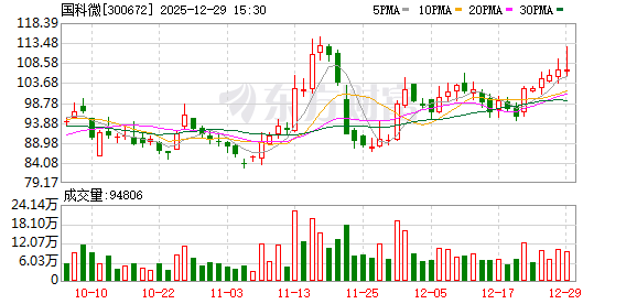 12月30日,国科微盘中上涨2.29%,截至13:50,报109.29元/股,成交6.09亿元,换手率2.70%,总市值 237.27亿元。 分红方面,国科微A股上市后累计派现3.71亿元。近三年,累计派现1.95亿元。 机构持仓方面,截止2025年9月30日,国科微十大流通股东中,香港中央结算有限公司位居第四大流通 股东,持股500.88万股,相比上期增加96.15万股。国联安中证全指半导体产品与设备ETF联接A (007300)退出十大流通股东之列。 责任编辑:小浪快报 资金流向方面,主力资金净流出3695.28万元,特大单买入4891.49万元,占比8.04%,卖出7781.98万 元,占比12.79%;大单买入1.55亿元,占比25.44%,卖出1.63亿元,占比26.77%。 国科微今年以来股价涨64.46%,近5个交易日涨6.96%,近20日涨7.09%,近60日涨15.88%。 资料显示,湖南国科微电子股份有限公司位于湖南省长沙经济技术开发区泉塘街道东十路南段9号,成 立日期2008年9月24日,上市日期2017年7月12日,公司主营业务涉及视频解码、视频编码、固态存储、 物联网等芯片的研发和销 ...